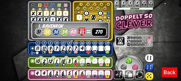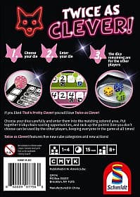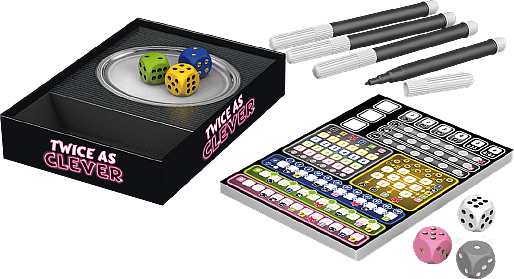 | Introduction: Twice as Clever takes the dice rolling challenge to the next level! Building upon the success of That's Pretty Clever, this sequel offers even more strategic depth and excitement for players who love a mental challenge. Each turn, the active player rolls six dice, chooses one of them to mark off a space on their scoring grid, places any dice with lower numbers aside, and then re-rolls any remaining dice. The white die is a joker and can be used as any one of the other five colors. After the active player chooses at most three dice, then the other players each choose one of the set-aside dice for use on their scoring sheet. Twice as Clever has five new dice-marking challenges and a new action beyond the re-roll and “use one more die” actions of the earlier game. |