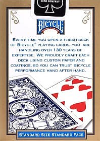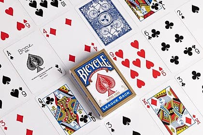 | Features: Design and History: The League Back design was first introduced in 1888 and is one of the oldest patterns used by the brand. The central motif features a bicycle wheel with three wings, an asymmetrical design (unlike most modernized symmetrical backs) that is believed to be associated with the logo of the League of American Wheelmen (L.A.W.). Quality and Finish: The cards are made in the USA from premium cardstock and feature the signature Air Cushion Finish, which allows for smooth handling, easy shuffling, and durability. Card Faces: The deck uses standard Bicycle card faces, making it instantly familiar and suitable for a wide range of games, including poker, blackjack, rummy, and solitaire. Versatility: The subtle one-way design of the back (due to the asymmetry of the central wheel motif) makes it a favorite among magicians for certain tricks, though this feature might also be noted by poker players. |
