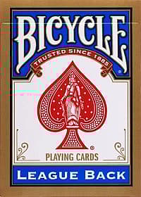| Introduction: League Back design was first introduced back in 1888, which makes it one of the oldest patterns used on Bicycle cards. Almost all vintage Bicycle designs were modernized to be symmetrical (two-way). League Back is an exception as it features an asymmetrical bicycle wheel placed in the middle. This deck uses the standard United States Playing Card company faces, making it great for magic. In essence, the Bicycle League Back deck offers a blend of heritage, quality craftsmanship, and a subtly distinct design for those seeking an alternative to the iconic Rider Back. |
