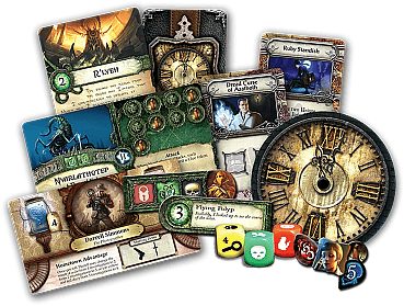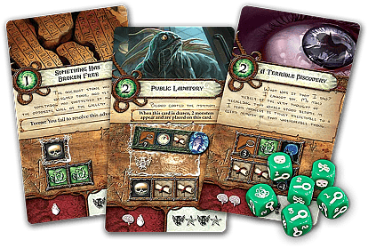 | Introduction: Evil from beyond has come to the museum! It is 1926, and the museum’s exotic curios and occult artifacts open barriers between our world and the elder evils lurking between dimensions. Other Worlds begin to leak through and terrifying creatures of increasing strength steal through them. Animals, the mad, and those of susceptible minds are driven to desperation by the supernatural forces that the portals unleash. In the midst of this chaos, a handful of investigators race against time to locate the eldritch symbols necessary to seal the portals forever and stop evil Ancient Ones from reducing humanity to cinders. Elder Sign is a fast-paced, cooperative dice game of supernatural intrigue for one to eight players by Richard Launius and Kevin Wilson, the designers of Arkham Horror. Players take the roles of investigators racing against time to stave off the imminent return of the Ancient One. Armed with tools, allies, and occult knowledge, investigators must put their sanity and stamina to the test as they adventure to locate Elder Signs, the eldritch symbols used to seal away the Ancient Ones and win the game. Are some questions best left unanswered? It no longer matters. The comforting blanket of ignorance is forever lost. Arcane knowledge beckoned from deep within the museum, so you entered. Now, unable to unlearn what you have learned, you must further steep yourself in arcane lore...and maintain your grip on reality long enough to delay humanity’s doom. "We shall see that at which dogs howl in the dark, and that at which cats prick up their ears after midnight." –H.P. Lovecraft, "From Beyond" |