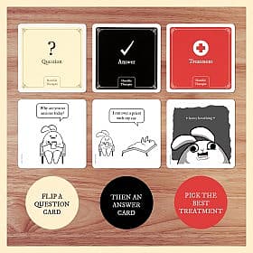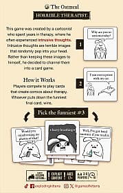 | Introduction: Therapy can be horrible so we made a game about it. Compete to create the funniest, most unhinged comic about therapy by submitting answer cards to complete a prompt. The player who puts down the funniest final card wins, turning therapy into a hilarious and darkly entertaining experience. You’ll laugh. You’ll gasp. You’ll be mildly offended (in a fun way). But ultimately, you’ll feel great when your intrusive thoughts help you win the game! Note: Explicit content. |