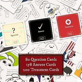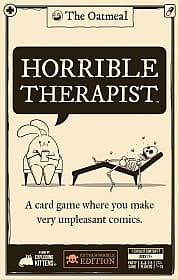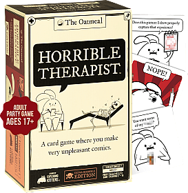 | Features: It's a card game where you make very unpleasant comics. Each card features hilarious original art by The Oatmeal. Everyone picks a Treatment Card to complete the comic. The funniest one wins! How to Play: DEAL: Give every player 5 Treatment cards. Keep them secret! Place the remaining Question, Answer, and Treatment Cards in the middle of the table. HIRE A THERAPIST: Pick someone to be the first Therapist. They’ll flip a card from the Question Deck and pick an Answer for the second panel of the comic. GIVE INTO YOUR INTRUSIVE THOUGHTS: Look at your Treatment Cards. Pick which one would be the best (or most unhinged) third panel of the comic. Play that card face down. READ: Once all the Treatments are in, the Therapist reads all of them and picks the one that best completes the comic. WIN: If your Treatment gets picked you win 1 point! The first player to 3 points wins (but this probably means you should schedule some extra therapy sessions, just in case!) Horrible Therapist - Extra Horrible Edition Includes: 80 Question Cards 158 Answer Cards 200 Treatment Cards Plus, one instruction manual that you will probably skim |