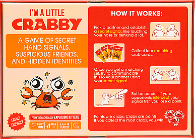 | Introduction: A game of secrets where you hide everything and suspect everyone. Scratch your nose, blink three times, tap your shoulder. A Game of Secret Signals Where You HIDE EVERYTHING and SUSPECT EVERYONE. I’m A Little Crabby teaches you how to sharpen your claws and mistrust—with enough sass to survive the cinematic divorce showdown ahead. Ideal for families, friends, and groups of all sizes who enjoy playful competition and teamwork. Perfect for game nights and parties where laughter is key. |