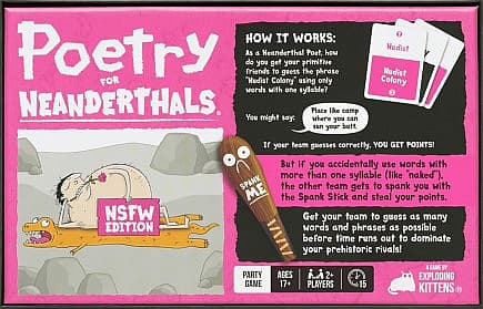 | Introduction: A word game where u must say bad words or get hit with stick. Poetry for Neanderthals: NSFW Edition is an adult party game where players earn points by getting their teammates to guess words and phrases. The catch is that they are only allowed to use single-syllable words. Enjoy getting grandma to guess phrases like “nudist beach,” “mile high club,” or “banana hammock,” but be careful. If you use any words with more than one syllable, the other team gets to spank you with the 2-foot inflatable Spank Stick. But maybe that’s not such a bad thing? |
