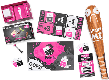 | Features: It's a board game that forces you to explain complicated ideas using simple vocabulary while sounding a little bit dumb. Cards are double-sided totaling 400 clues for maximum re-playability! Includes a 2-foot inflatable Spank Stick for guaranteed laughs and ultimate enjoyment. How to Play: You’re given a word. You have to get your team to guess that word. But you can only speak in single syllables. Poetry for Neanderthals - NSFW Edition Includes: 200 Double-Sided Cards 2 Game Boards A 2-foot Inflatable Spank Stick 1 Sand Timer Plus one instruction manual that you will probably skim |