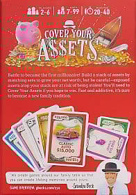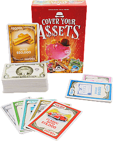 | Features: Stacks up your assets by pairing sets of cards like Piggy Banks, Cash Under the Mattress, Jewels, Classic Autos, and more. Each new set covers the one beneath it! But watch out! Other players can challenge and steal the top set on your stack if they reveal a matching asset or a wild silver or gold card. Don't worry though, you can defend yourself by revealing your own matching asset or wild cards. The player who last reveals a card takes or keeps the set, along with all the cards used in the challenge, making it more valuable and tempting for others to grab. Perfect for both kids and adults, this game will have everyone playing and laughing all night long. Cover Your Assets Includes: 110 Cards |