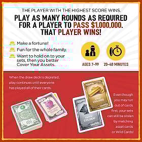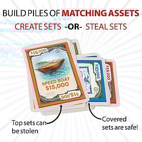 | Introduction: COVER YOURS, STEAL THEIRS. MAKE A FORTUNE! Battle to become the first millionaire! Build a stack of assets by matching sets to grow your net worth, but be careful: exposed assets atop your stack are at risk of being stolen! You'll need to Cover Your Assets if you hope to win. Fast and addictive, it's sure to become a new family tradition. Now includes two and three player rules, PLUS both classic and new advanced rules to enjoy! An addictive game of give and take. Loved by all ages! |