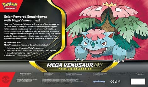 | Features: The Pokemon TCG: Mega Venusaur ex Premium Collection Includes: 1 foil promo card featuring Mega Venusaur ex 1 oversize lenticular promo card featuring Mega Venusaur ex 1 tech sticker featuring Mega Venusaur 8 Pokémon TCG booster pack A code card for Pokémon TCG Live |